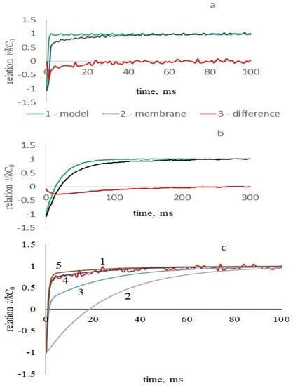 Figure 4c depicts the calculated initial current of the membrane response to the upward cycle of command voltage for various values of the proportion of the viscous elastic part in membrane 1 − ϰ. Thus, the presence of purely elastic and viscoelastic branches in the equivalent circuit makes it possible to adequately describe the transient processes in the current response of the membrane, which consists of two exponents. A value of 1 − ϰ in the range of 0.1–0.2 is suitable for all considered experimental data.
