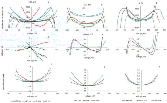 A set of representative results is presented in Figure 5. As can be seen from the left column, in the studied frequency range, the parameters of the equivalent circuit, the membrane nonlinearity, and the loop width also strongly depend on the frequency of the periodic command signal. As the frequency decreases, k decreases, but the nonlinearity coefficient β increases monotonically. The loop width proportional to the apparent negative conductance is maximum at an intermediate frequency of 0.5 Hz. At a frequency of 0.01 Hz, the hysteresis disappears and the apparent conductance becomes positive. At a frequency of 1 Hz, the loop decreases; at 2 Hz, the current response of the membrane corresponds to the current response of a linear capacitor. These frequency dependences are related to the characteristic times of viscoelastic processes responsible for the delay of the true field from the applied and dynamic capacitive response to a periodic triangular voltage. At the amplitude of the triangular voltage 200 mV (Figure 5, middle column), the width of the pinched hysteresis loops also strongly depends on the frequency of the command voltage. At frequencies of 1 and 2 Hz, the apparent conductance is almost the same; at a frequency of 0.2 Hz, the hysteresis disappears, and the apparent conductance becomes positive. Unfortunately, at low frequencies, the membranes cannot withstand high voltage and often break. An increase in amplitude (Figure 5, right column) at a constant frequency of 2 Hz leads to an increase in apparent conductance and loop width in proportion to increasing k. The nonlinearity of the capacitance practically does not change. The loop width and, accordingly, the insertion conductance increase proportionally to k.