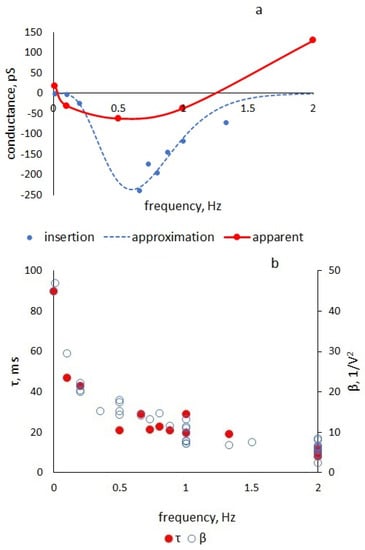 (a): Dependence of apparent and insertion conductance calculated by Formula (20) with parameters β and τ calculated from experimental data on triangular voltage frequency. The calculation did not take into account the ionic conductance of the membranes (g = 0). (b): Dependence of the values of β and τ calculated from experimental data on the frequency of the triangular voltage.