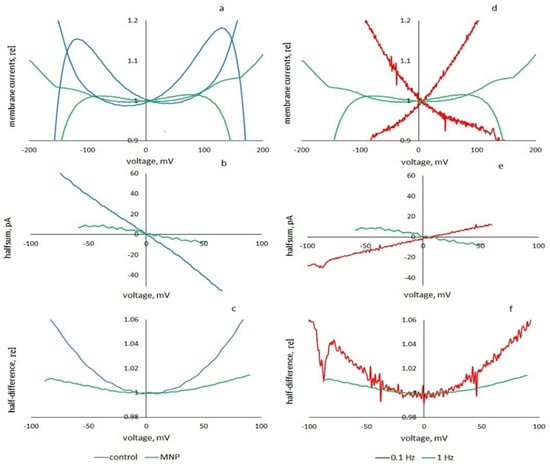 The effect of cobalt ferrite particles on the viscoelastic current responses of the membrane to a triangular voltage with an amplitude of 200 mV: hysteresis loops (a,d), apparent conductance currents (half-sums) (b,e), and nonlinear capacitance dependences (half-differences of experimental curves in relative capacitance units) (c,f). On the left—the effect of nanoparticles: the control and results are presented when particles are added, the frequency is 1 Hz; on the right—the influence of the signal frequency on the characteristics of the membrane with particles. The data are shown for frequencies of 1 and 0.1 Hz.