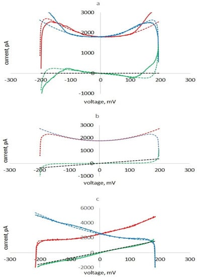Experimental (solid) and calculated (dotted lines) hysteresis curves (red), (blue) and their halfsum (green) and calculated ionic currents (dotted black lines) for three cases: with negative (a), zero (b) and positive (c) apparent conductance. Experimental curves—current responses of the azolectin membrane in 0.1 M KCl with low (a) and high (c) conductance to a triangular voltage with a frequency of 2 Hz and an amplitude of 200 mV. Equivalent circuit parameters: C0 = ; γ = 0; g = 0 (a), 1.72 nS (b), 8 nS (c).