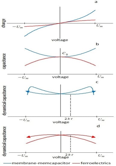 Characteristics of membrane-memcapacitor (blue) and ferroelectrics (red): (a)—charge–voltage characteristics, (b)—dependences of the nonlinear capacitance on voltage. For the membrane in the absence of viscous effects in the first quarter of the period, the capacitor is discharged, the source work is negative, in the second quarter it is charged, the source work is positive, the source work for the half-cycle is zero, and the system is neutral. For a ferroelectric in the first quarter—charging, in the second—discharging, the system is neutral. (c)—dependence of the dynamic capacitance of the membrane (of the ferroelectric) on voltage. Due to the delay in polarization, part of the half-cycle of the triangular voltage, when the capacitor is discharged, increases; as a result, there is a negative insertion conductance. Delaying polarization with this type of nonlinearity reduces losses and results in pinched hysteresis. The system is active. (d)—dependence of the dynamic capacitance of the ferroelectric on voltage. Due to the delay in polarization, the part of the half-cycle of the triangular voltage, when the capacitor is charged, increases; as a result—there is a positive insertion conductance. Delaying polarization with this type of nonlinearity increases losses and does not show pinched hysteresis. The system is passive.