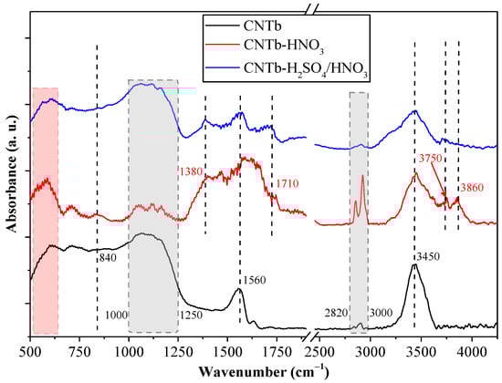 The complex signal at 1320–1500 cm−1 was not explicitly present here, an issue that needs further investigation. Moreover, this signal was suppressed by the presence of bands related to NO3− and N–O species [41] located at 1380 and 1560 cm−1 (samples CNTb–HNO3 and CNTb–H2SO4/HNO3), which could contribute to the polar surfaces of these samples. The shoulder located at 1710 cm−1 was also present in the oxidized samples, indicating the existence of surface anchored the –COOH groups. The successful completion of the oxidation process is also demonstrated by the appearance of the signals specific for H bonds originating from the polar groups at 3750 and 3860 cm−1. However, the efficiency of the oxidation of CNTb cannot be determined from the IR spectra as the main spectral features are quite similar to those of CNTb–HNO3 and CNTb–H2SO4/HNO3. Unexpectedly, the intensity of the 2820–3000 cm−1 band was not in line with the observations made for the CNTa sample. It should be noted that the 500–630 cm−1 region is another fingerprint region for carbon-based materials; thus, they were not considered in the analysis of either sample.