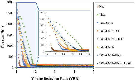 The filtration experiments proved that the functionalized membranes (TiO2/CNTa-OH, TiO2/CNTa-COOH, TiO2/CNTb-HNO3, and TiO2/CNTb-HNO3_H2SO4) had significantly higher flux values at the initial stages (until VRR < 1.5) than the membranes coated with non-functionalized CNTs (TiO2/CNTa and TiO2/CNTb), indicating the positive effect of the surface modification. Simple TiO2 coating also resulted in a notable (~50%) flux enhancement, but via the different TiO2/CNT coatings, much higher (~2–4 times higher) fluxes were achieved compared to the uncoated membrane (at VRR = 5).