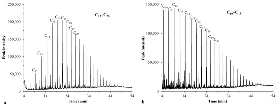 Figure 4a shows that the chromatogram of the previously used crude oil (sample 1) was dominated by medium-chain hydrocarbons (C15–C20). In contrast, the crude oil used in this study (sample 2) had a high proportion of shorter-chain hydrocarbons (C10–C15) (Figure 4b).