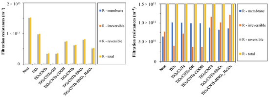The irreversible resistances of the membranes showed that the hydrophilicity and the zeta potential were simultaneously crucial for reducing the total membrane fouling. The zeta potentials of the TiO2-coated and TiO2/CNTa nanocomposite-coated membranes (TiO2/CNTa, TiO2/CNTa-OH, and TiO2/CNTa-COOH) were significantly negative (−25, −22, and −40 mV, respectively). This was beneficial since the oil droplets of this study also had negative zeta potential (−43.3 mV) as usual, resulting in a significant electrostatic repulsion and reduced liability of the oil droplets to adhere onto the membrane surfaces or pores. In contrast, the zeta potentials of the TiO2/CNTb, TiO2/CNTb-HNO3, and TiO2/CNTb-HNO3_H2SO4 membranes were only −5, −4.5, and −6.5 mV, respectively. Therefore, despite the measured low contact angles (high hydrophilicities), the irreversible resistances were by far the highest in these cases.