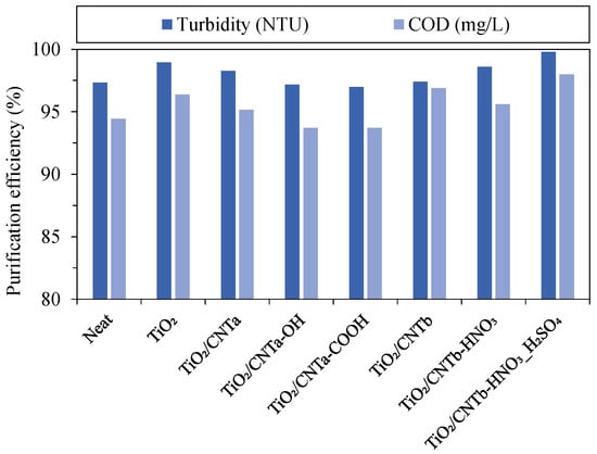 All membranes had satisfactory purification efficiency (Figure 6) with 97–99.8% (based on turbidity values), regardless of the membrane type. These numbers were slightly lower (93.7–98%) when the purification efficiency was evaluated in terms of COD. This discrepancy can be attributed to the fact that dissolved impurities that can pass through conventional microfilter membranes also contribute to the COD of the permeate. Nevertheless, comparable or superior results were obtained for the modified membranes compared to the reference membrane.