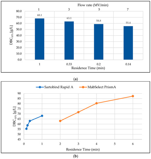 Figure 1 compares DBC10% for the membrane and resin chromatographic devices (based on UV breakthrough curves) at vendor-recommended operating flow rates considering process-scale application. For residence times of ≤1 min, the DBC10% for Rapid A showed a dependence on flow rate and ranged from 55.4 g/L to 68.1 g/L (Figure 1a) [9]. The MabSelect™ PrismA resin showed a similar dependence of DBC10% on residence time (2–6 min), ranging from 63.1 g/L to 87.4 g/L (Figure 1b) [8]. The UV-based DBC10% results were complemented by mAb detection in flowthrough fractions via ProtA-HPLC assay. Representative results for this approach, using the 5 MV/min flow rate, are shown in Figure A1, in Appendix A.