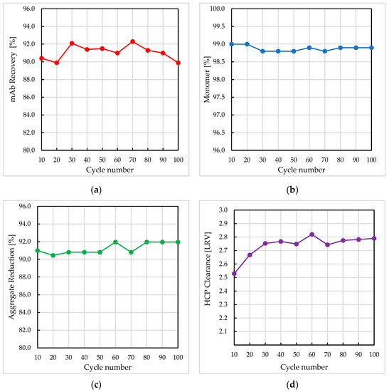 Performance of Sartobind® Rapid A membrane over 100 purification cycles. Data for every 10th cycle is shown for (a) mAb recovery (%), (b) onomer (%), (c) aggregate reduction (%), and (d) HCP clearance log reduction value (LRV).