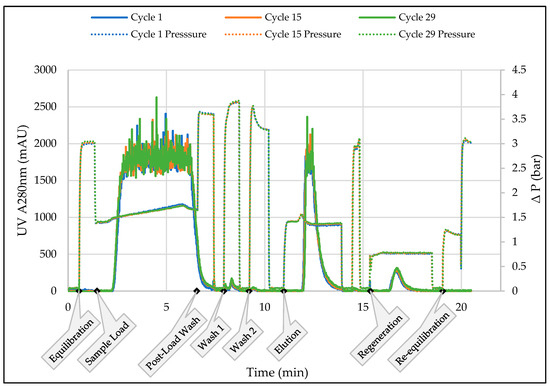 Figure 4 shows an overlay of UV-280 nm profiles for 3 out of the 29 purification cycles for the second 50 L purification episode at 35 g/L load density. The profiles showed good reproducibility. The UV profile was similar to that observed at the 1 mL scale save for the noise in the signal during the product loading and elution phases, which was a function of UV detector saturation. Product quality and recovery were comparable between the 1 mL and 75 mL membrane devices (Table 5).