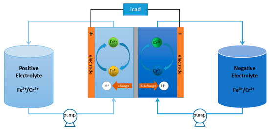 The redox flow battery (RFB) [1] was proposed by NASA in 1974, which possesses the superiority of environmentally friendly, high safety, recyclable electrolyte, long cycle life, and cost-effective life cycle [2,3]. After 50 years of investigations and developments, it has evolved into one of the best methods for a large-scale energy storage system to solve the problems of intermittent renewable energies, such as wind and solar [4]. Among them, the all-vanadium redox flow battery (VRFB) has been implemented in a series of relatively mature demonstration projects due to its stable performance [5], which proves the practicability of RFB based on long-term and large-scale energy storage at the grid level [6]. However, the high cost of vanadium greatly restricts the further development and wide industrial application of the VRFB [7,8]. Nowadays, with the optimization of electrolyte and hydrogen evolution problems [9], ICRFB with substantial and economical materials has come back into view again [10].