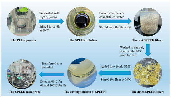 In total, 0.6 g SPEEK was added into 10 mL N, N′-dimethylformamide (DMF), and the solution was magnetically stirred for 2 h in a 50 °C water bath until the SPEEK was dissolved completely. Then the solution was transferred to a Petri dish and dried at 60 °C for 6 h and 100 °C for 4 h, respectively, in a vacuum oven. After the Petri dish was cooled to room temperature, it was further immerged in distilled water to separate the obtained sample. In order to remove the impurity and achieve the best property, the sample was immerged in 1 M sulfuric acid solution for 24 h. Finally, it was rinsed with distilled water till the pH reached neutrality and deposited in distilled water. Figure 2 shows the preparation processes of SPEEK polymer/fibers and SPEEK membrane.