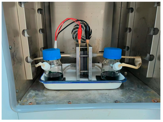 The ICRFB was built up by sandwiching the membrane with a 5 cm × 5 cm active area between double 4.5 mm thick graphite felts. Two copper foils and graphite bipolar plates were used as the current collectors. In total, 40 mL electrolyte consisting of 1 M FeCl2 + 1 M CrCl3 + 3 M HCl served as the cathode/anolyte [37], and they were transported by the peristaltic pump (DIPump550, Kamoer, Shanghai, China), the flow velocity was set at 100 rpm (115 mL/min). Figure 3 shows the photograph of the ICRFB single-cell.