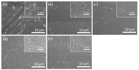 SEM images of the surface of the SPEEK membranes: (a) SPEEK 43; (b) SPEEK 47; (c) SPEEK 52; (d) SPEEK 57; (e) SPEEK 62.