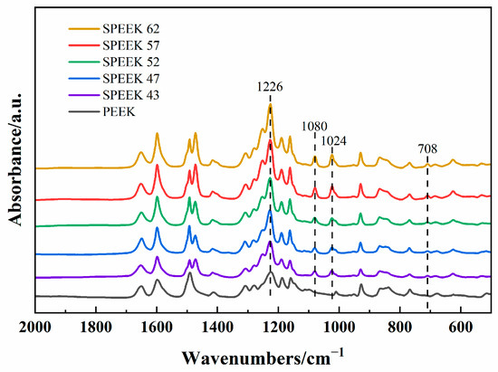 The morphologies of five DSs SPEEK membranes can be seen in Figure 4a–e. According to Figure 4a, SPEEK 43 presents the coarsest morphology with the other membrane presenting a relatively smooth surface as Figure 4b–e. This phenomenon is because when the DS is too low, the solution of SPEEK in DMF or the other organic solvents will no longer be clear and appears milky [39] as observed during the process of the preparation. The FTIR results of five DSs SPEEK and the pure PEEK powder are shown in Figure 5. The addition of -SO3 groups during the sulfonation process makes SPEEK exhibit four new absorption peaks, including S-O stretching (708 cm−1), S=O stretching (1024 cm−1), symmetric stretching of O=S=O (1080 cm−1), and asymmetric of O=S=O (1226 cm−1) [24,40]. These characterizations reflect that the -SO3 groups are added to the SPEEK membranes successfully. Moreover, the increase in these peak intensities is corresponds to an increase in DS, demonstrating the concordance of membrane and properties.