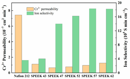 Table 1 exhibits the physicochemical properties of five DSs SPEEK membranes and Nafion 212. As DS increases, IEC, proton conductivity, WU, and SR of the membranes are higher as well, especially based on the results of SPEEK 52 and SPEEK 57. The results demonstrate that the physicochemical variation in the SPEEK membranes is nonlinear. As Figure 6 shows, all the SPEEK membranes present a significantly lower Cr3+ permeability than the Nafion 212; this is because the steric hindrance which is produced by the aromatic ring structures of the SPEEK membranes reduces the Cr3+ permeability [41]. However, the Cr3+ permeability of SPEEK 43 is higher than that of SPEEK 57, which may be due to the defective morphology that was observed in Figure 4a. On the one hand, the higher DS brings higher WU so as to reach better proton conductivity, but the worse stability and higher Cr3+ permeability are also inevitable due to the higher SR [42]. On the other hand, too low DS not only reduces the proton conductivity but also elevates the Cr3+ permeability, leading to the worst ion selectivity afterward. Therefore, the DS of SPEEK membranes should be moderate to achieve the best combination property. The Fe2+ permeability behavior of the various membranes is attached in Figure S1, and it is obviously lower than that of the Cr3+. However, the permeability and ion selectivity for the membranes exhibit similar tendencies compared with the results of Cr3+, which further prove the different ion-selective ability of the membranes.