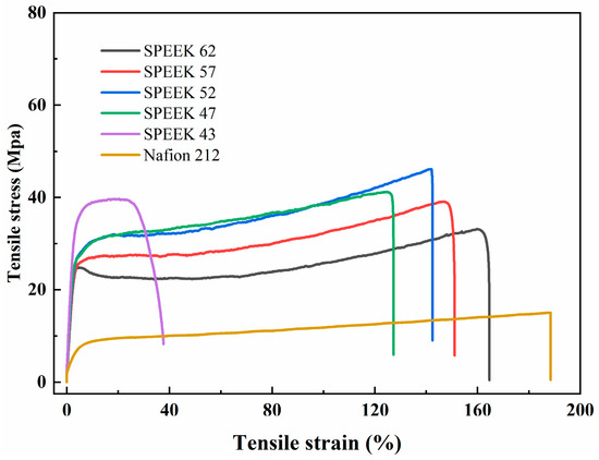 The mechanical properties are crucial for the proton exchange membranes, and they are shown in Table 1 and Figure 7. It could be found that all the SPEEK membranes present a higher tensile strength and Young’s modulus than the Nafion 212, which was owing to their higher rigidity resulting from the rigid aromatic ring structure [24]. With the increase in the DS, the tensile strength of the SPEEK membranes exhibits a tendency to climb up and then decline while the percentage elongation progressively grows. Considering the rigidity and ductility of the SPEEK membranes comprehensively, the mechanical properties of SPEEK 57 are the most balanced.