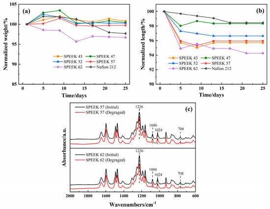 The past works confirm that 65 °C is the best operating temperature for ICRFB [43], and this condition has increased the requirement for the chemical stability of the membranes. All the various DSs SPEEK and Nafion 212 membranes were immersed in the electrolyte at 65 °C for 25 days. The outcomes are demonstrated in Figure 8a,b, and it is intuitive to see both length and weight tend to be stable for all the membranes after half a month. For the normalized weight, SPEEK 62 decreases the most, Nafion 212 decreases the second, and the decrease in SPEEK 57 is close to SPEEK 52. For the normalized length, SPEEK 62 still presents the most decrease, while Nafion 212 presents the least. These results indicate that SPEEK 62 has the worst chemical stability, and the other SPEEK membranes have advantages in terms of chemical stability for weight compared with the Nafion 212.