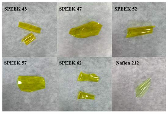 Photographs of SPEEK membranes with various DSs and Nafion 212 after the chemical stability test.