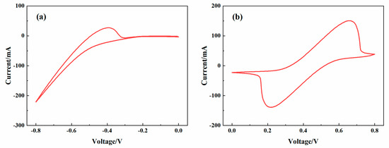 The characteristics of the iron-chromium redox species in the electrolyte are determined by cyclic voltammetry (CV) through an electrochemical workstation CHI760E of Shanghai CH Instrument Co., Ltd. (Shanghai, China). The experiment was carried out in the standard three-electrode system at ambient temperature [36]. The reference and counter electrodes were calomel electrode and platinum sheet electrode, respectively, and the working electrode was the graphite felt, which size was 1.5 cm × 2.0 cm. The scan window of the CV curve is limited to 0.0~0.8 V and −0.8~0.0 V.