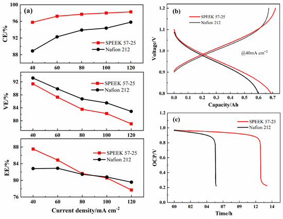 The charge–discharge capacity curves of the two membranes under 40 mA cm−2 have been compared as well, the cycling capacity of the SPEEK 57-25 is greater than that of the Nafion 212 as shown in Figure 11b. The charge voltage of Nafion 212 is lower at first but higher than that of SPEEK 57-25 at last. This is because the Nafion 212 has a lower ion selectivity and a lower EE, which leads to the ICRFB assembled with Nafion 212 has a higher internal resistance at the late reaction period [53]. Additionally, the lower metal ions permeability makes SPEEK 57-25 own a higher discharge voltage during all the periods. The open circuit potential (OCP) curves of ICRFB assembled with these two membranes are shown in Figure 11c, and these two ICRFBs were firstly charged to a state of charge (SOC) ca. 50% at 80 mA cm−2. After 6 h, the ICRFB assembled with Nafion 212 first dropped sharply to 0.2 V, while the ICRFB assembled with SPEEK 57-25 dropped sharply to 0.2 V at a time more than twice as long compared to that of the Nafion 212. This longer discharge time indicates that the metal ions permeability of SPEEK 57-25 is still far lower than the Nafion 212 even though it has an ultrathin thickness [54,55], and it is consistent with the results of Figure 6, as shown above.