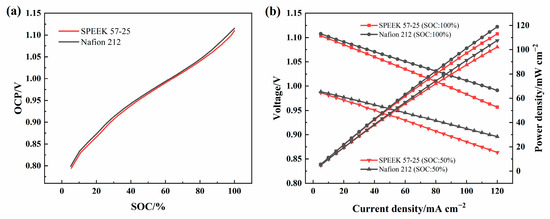 (a) OCP-SOC curves of SPEEK 57-25 and Nafion 212 under 80 mA cm−2; (b) the polarization curves of the cells under 100% SOC and 50% SOC with SPEEK 57-25 and Nafion 212.