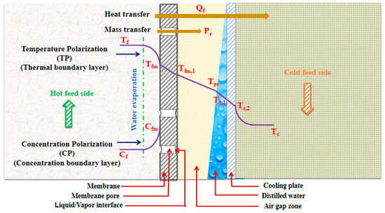 A schematic diagram illustrating temperature polarization (TP) and concentration polarization (CP) taking place in the AGMD module is shown in Figure 1. At the liquid–vapor interface on the hot-feed membrane side where water evaporates, a simultaneous temperature decrease and concentration increase occur [30].