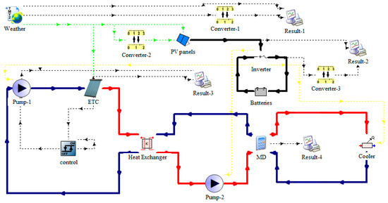 The SP-AGMD model using a solar collector and photovoltaic (PV) panels was simulated by the TRNSYS program. As shown in Figure 2, the AGMD module was determined by a new equation in the TRNSYS simulation. All components of the solar AGMD model were presented as follows: a Type 91 heat exchanger, a TYPE109-TM2 reader and processer of meteorological data, a Type 2 differential temperature controller, a Type 1 flat plate collector, Type 94 photovoltaic panels, a Type 3 single speed pump, a Type 48 inverter, a Type 47 storage battery, Type 57 unit conversion, a Type 65 online plotter, and a Type 92 auxiliary cooling unit.