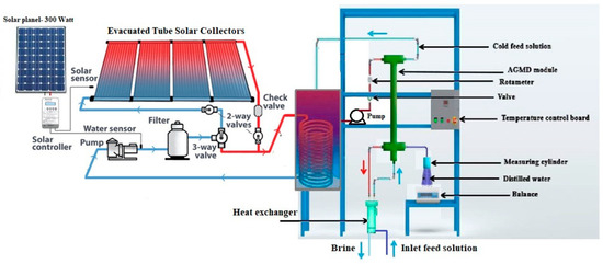 A schematic diagram of the SP-AGMD system utilized in this investigation is illustrated in Figure 3. The membrane distillation (MD) system consists of a feed tank, AGMD module, rotameter, water pump, electronic balance, measuring cylinder, valve, PV panels, evacuated tube solar collector, solar controller, and heat exchanger. The detailed specifications of the circulation pump, evacuated tube, and heat exchanger employed in this investigation are listed in Table 3. Electrical power to the water pumps was provided using solar panels. In the membrane distillation (MD) module, a feed solution was preheated using the heat exchanger and fed into the cold feed side. The outlet solution was heated using a solar heat exchanger to a specific temperature. A centrifugal pump was used to pump the outlet stream into the hot-feed side in AGMD. The evacuated tube collector (ETC) was used to provide the required heat to raise the temperature of the hot-feed side in the solar heat exchanger. Figure 3 schematically displays the itinerary of the salt solution inception from the feeding tank until it is collected as pure water in the measuring cylinder. The hot salt solution was pumped from the feeding tank into the PVDF membrane module by a circulation pump. After that, it crossed through the membrane module (indicated in red), where vapor diffused through the pores of the membrane.