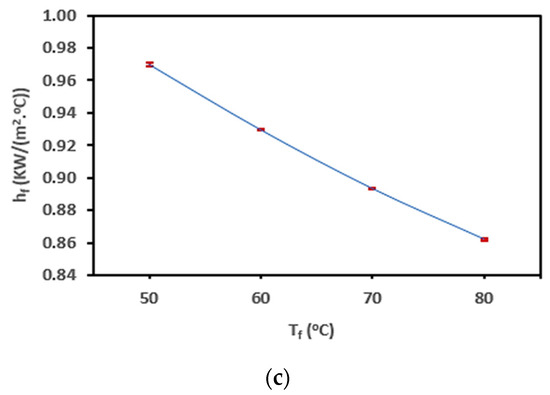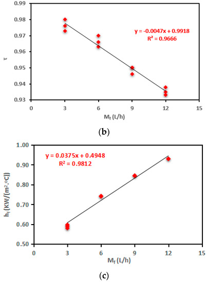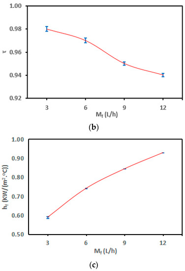 The one-way ANOVA results are given for Pr, τ, and hf in Table 6 and Figure 6a–c. Due to p-values < 0.05, the results of ANOVA showed that the flow rate (Mf) induced highly significant differences on Pr, hf, (p < 0.001 ***) and a significant difference on τ (p < 0.05 *). Also, large F-ratios corresponding to the flow rate (Mf) are considered the most influential parameter.