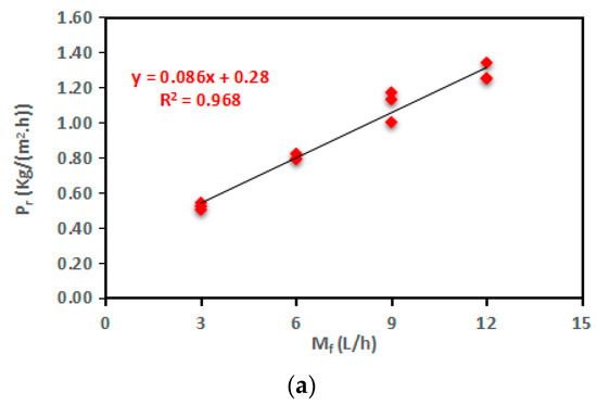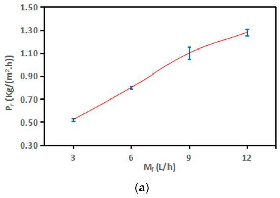 The experiments were conducted using flow rates of 3, 6, 9, and 12 L/h. These flow rates corresponded to feed velocities of 0.014, 0.028, 0.041, and 0.055 m/s, respectively. The experiments were performed at a feed temperature of 60 °C, a cooling temperature of 20 °C, and a concentration of 0.5%. An impressive increase of 146% in productivity (Pr) was achieved, going from 0.52 to 1.28 kg/(m2·h) as the flow rates raised from 3 L/h to 12 L/h in increments of 3 L/h, as displayed in Figure 6a. These experimental findings aligned with the results by Zhang et al. [52] and Duong et al. [53].