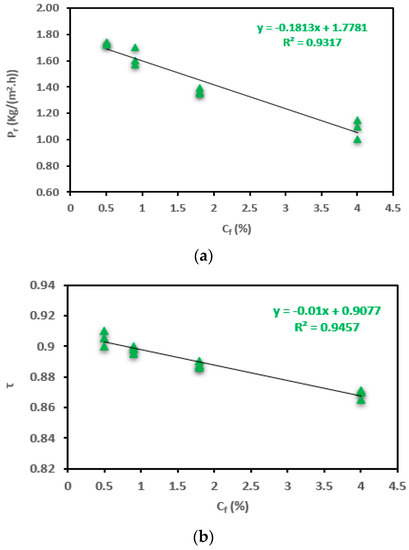 Other researchers [18,19] have conducted experimental studies to assess how feed salt concentration (Cf) and concentration polarization (CP) affect MD productivity (Pr). Results have shown that productivity (Pr) dropped from 13% to 28% as Cf increased from 30 to 120 g/L, respectively. According to Martínez [20], the reduced MD productivity (Pr) was attributed to a decrease in water activity and an increase in Cf.
