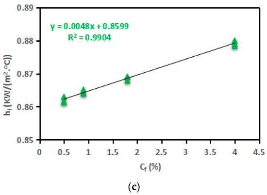Figure 6c exhibited notable increments of 26%, 14%, and 10% in the heat-transfer coefficient (hf). Given that the mass and heat transfer processes transpired simultaneously within the AGMD module [56], the enhancement in the heat-transfer coefficient (hf) would consequently be mirrored by analogous increases in the mass-transfer coefficient (Kf).