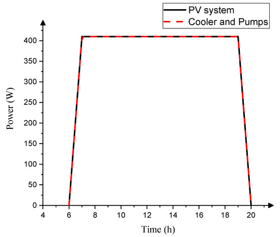 The electrical power of the cooler circulation water pumps of ETC and AGMD is required for the AGMD process. Therefore, photovoltaic (PV) panels were used for the SP-AGMD system to save costs, as they constitute renewable energy. Therefore, the electrical power was calculated and replaced by two PV panels, each with an area of 1.6 m2 and a power of 300 W, using three batteries (12 V, 200 Ah) via the TRNSYS program. The power of the PV system covered the electrical power of the cooler circulation water pumps, according to the specifications listed in Table 2 [44].