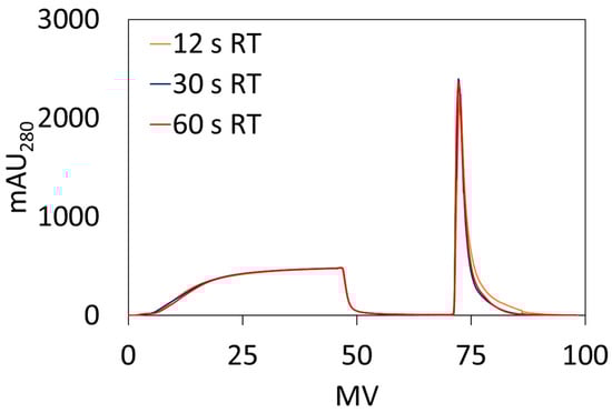 DBC10 measurements were performed using 2 mg/mL hIgG loading concentration at residence times (RT) of 12, 30 and 60 s. Figure 4 shows the chromatograms, and Figure 5 shows the calculated DBC10 values as functions of RT and breakthrough percentage. A t-test showed that there was no statistical significant in variation of DBC10 with flowrate. This phenomenon is common in membrane adsorbers, suggesting the convective transport of hIgG from solution to the Protein A ligand. Average DBC10 across all flowrates was 10.12 ± 1.82 mg/mL membrane.