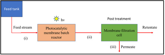 The integrated photocatalytic membrane system consisted of three main process streams connecting the IPMS into a single continuous flow mode: (i) the feed stream, (ii) the semi-batch reactor output stream (which was used as the feeding stream to the membrane filtration unit), and (iii) the permeate stream. Water samples collected from a South African water treatment plant were used during photodegradation and rejection investigations (real water parameters are given in the Supplementary Material in Table S1). Naproxen (5 mg/L) was used as a model pharmaceutical pollutant to evaluate the performance studies of IPMS. In the semi-batch reactor unit, irradiation was provided by a HAL-320 Compact Xenon light source with a bulb rating of 300 W and an apparent power of 500 VA.