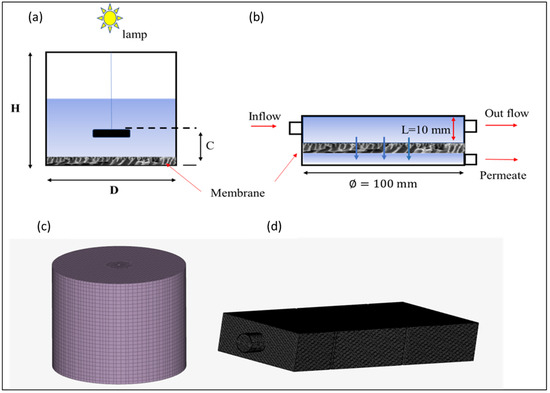Virtual representations of (a) the photocatalytic reactor dimensions and (b) the membrane filtration dimensions, (c) the mesh for the photocatalytic reactor, and (d) the mesh for the membrane filtration unit.