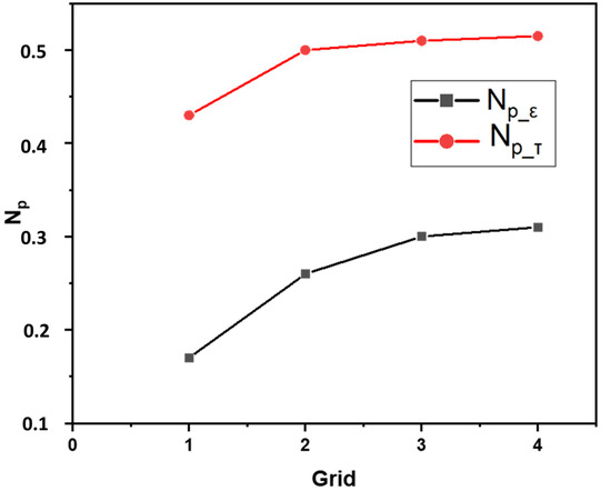 The grid independence was assessed using the predicted power number [21]. Two calculations were performed to determine the power consumption (P) in this evaluation. Firstly, the power number ( was computed using Equation (13), where torque was used to estimate the power number.