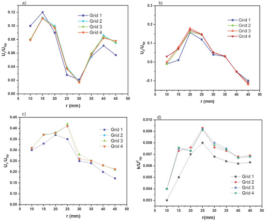 Radial profiles of the azimuthally averaged velocity components (a) radial velocity, (b) axial velocity, (c) tangential velocity, and (d) turbulent kinetic energy.