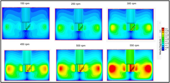 The flow field in the batch reactor was investigated, and Figure 6 depicts the variation of the velocity magnitude at different rotating speeds from 150 to 550 rpm at (C = H/3). The spatial distribution of velocity showed that the velocity magnitude increased with the mixing speed. At 150 rpm and 250 rpm, the highest velocity zones are displayed by green contours. From the scale bar (Figure 6), a maximum of 0.2 m/s was attained via a small fraction of the reactive mixture close to the mixer, and the magnitude decreased towards the peripherals of the reactor. A similar pattern was observed previously in the literature [28,29]. At low mixing speeds, dead zones in the reactor were demarcated by dark-blue contours corresponding to the 0 and 0.05 m/s in the scale bar of Figure 6, which are distinguished by extremely low velocities. However, it was observed that as the speed increased from 150 to 300 rpm, a larger fraction of the reactive mixture gained up to 0.3 m/s velocity. The increase in velocity was anticipated to improve reaction efficacy by increasing the mass transfer of the reactive species.
