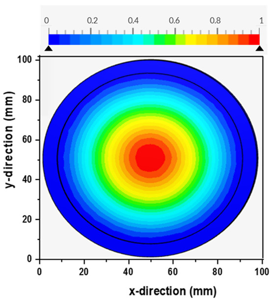 The photonic efficiency in photocatalytic membranes is highly dependent on the dispersion of light over the membrane. Figure 8 depicts the simulated homogeneity of the light on the surface of a flat-sheet photocatalytic membrane. The light source was positioned 150 mm from the reactor’s top surface. It is known that the irradiation distribution profiles can be utilized to improve the efficiency of the process by spotting dimly illuminated regions in the reactor [29]. Using Equation (9), the incident radiation uniformity index was derived to assess light distribution on the membrane surface. The incident radiation uniformity index measures the uniformity of a changing field over a surface and is based on local fluctuations in relation to the mean value of the irradiated area. An index value of 1.0 denotes the highest uniformity. In this study, a homogeneity index for incident radiation of 0.56 was attained. The index value 0.56 is comparable to the results obtained in previous reports [12]. Casado et al. [12] illustrated that a higher degree of uniform light distribution can be obtained when smaller areas are employed.