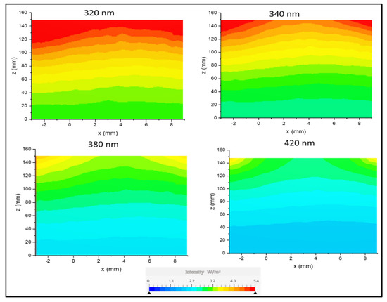 Given the obtained irradiation distribution value (0.56) on the membrane surface along the X and Y plane, it was necessary to predict how irradiation was dispersed throughout the reactor as this might have a significant impact on the photonic efficacy of the process. The reactor was positioned vertically to ensure that the beams irradiate the reactor at the zenith angle. The radiation transport equation (RTE) was solved at four different light wavelengths, and the distribution of the irradiation intensities was simulated, as shown in Figure 9.