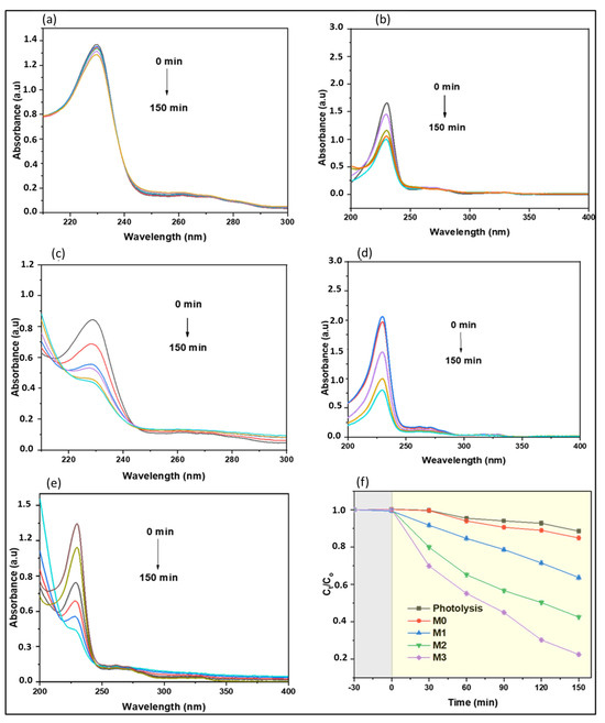 Variation of the UV-Vis spectra of naproxen over time in a batch reactor by (a) photolysis, and photocatalysis degradation using CoFe2O4-PES membranes; (b) M0—pristine; (c) M1—0.2 wt.% CoFe2O4; (d) M2—0.5 wt.% CoFe2O4; and (e) M3—1 wt.% CoFe2O4; (f) effect of time on the degradation of naproxen (grey zone incidates experiment without irradiation and yellow zone indicates experiment under irradiation).