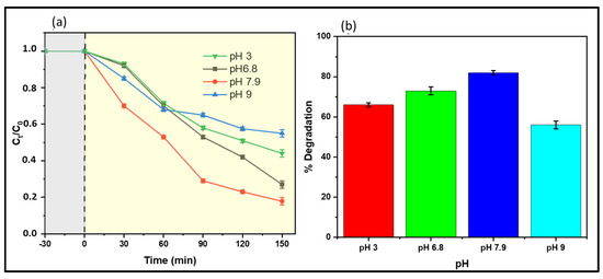 pH plays a critical role in the photocatalytic degradation process, as it affects the speciation of photocatalysts and targeted contaminants. Figure 11 illustrates the effect of pH on naproxen degradation. The results infer that the heterogeneous system can remove naproxen over a broad range of pH from 3.0 to 9.0, which covers the pH range of most real drinking water and wastewater. Lower degradation performances were detected at strongly alkaline (pH 9) and acidic (pH 3) conditions. Under acidic conditions, less degradation profile (Figure 11a) was ascribed to adding HCl solution during pH adjustments. The Cl− ions from HCl may have reacted with •OH radicals and produced inorganic radicals (such as ClOH−•). These ClOH−• anion radicals generally have lower reactivity than hydroxyl radicals. As a result, a competition between the naproxen and Cl− ions for •OH radicals occurred, inhibiting naproxen degradation. On the other hand, Gong et al. [30] reported a positive effect that resulted from the dissociation of ClOH−• to Cl•; this was not the case in this study. Excess chloride ions may have reacted with the generated Cl• to form Cl2−• (Equation (19)) with low reactivity.