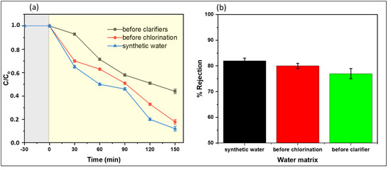 Furthermore, water samples collected before the clarifier had the highest turbidity (22.5 ± 2.6 (Table S1)). High turbidity acted as an inner irradiation filter, hence minimizing the accessibility of irradiation to the membrane’s active sites, leading to insufficient generation of reactive species. The performance of water samples collected before clarification was attributed to low turbidity of 6.2 ± 0.02 and low concentration of NOM. Regarding rejection, no significant effect of the water matrix was observed on performance towards naproxen rejection (Figure 12b). Rejection depends on the target pollutant’s properties and the membrane’s characteristics, including pore size and electrostatic and non-electrostatic interactions. In this work, using CoFe2O4-PES membranes demonstrated physiochemical properties that facilitated the rejection of naproxen through multiple mechanisms. Adding CoFe2O4 nanoparticles to the membranes resulted in the formation of a dense and thick active layer (Figure S1), effectively reducing the pore size. This decrease in the membrane’s molecular weight cut-off (MWCO) limited the passage of naproxen, leading to higher removal through size exclusion or sieving effects.