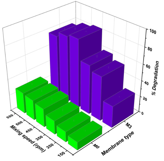 The influence of different mixing velocities on naproxen degradation is illustrated in Figure 13, where pristine membrane (M0) was used as the control experiment. The increment in mixing speed improved degradation performance from 44% (150 rpm) up to 84% (450 rpm) for M3 (Figure 13). A similar trend was observed for M0. M0’s performance increased from 12 to 18%. The increase in performance was attributed to the kinetic energy gained by the reactive species and naproxen. This improved the intensive interfacial contact between reactive species and facilitated optimal mass transfer. The chances of successful collision between reactive radicals and naproxen molecules in the photocatalytic process improved with the magnitude of speed. Visan et al. reported similar findings [33]. However, this study noted that after 450 rpm, there was a slight decrease in performance. This decline could emanate from the ineffective collision of reactive species due to rapid motion beyond optimum effect. These results confirm the findings obtained with simulation studies (Section 4.3). Although a well-established correlation exists between increased mixing and higher convective mass transfer, most research in this field has focused primarily on slurry photocatalytic degradation systems. Comparatively, fewer studies have been conducted on immobilized systems, particularly batch reactor systems with flat sheet membranes and liquid systems. The primary objective of our study was to investigate whether convective mass transfer can effectively facilitate pollutant interaction with the active sites in an immobilized system without filtration. By examining this specific configuration, we aimed to bridge the gap in the existing literature and shed light on the effectiveness of convective mass transfer in such systems.