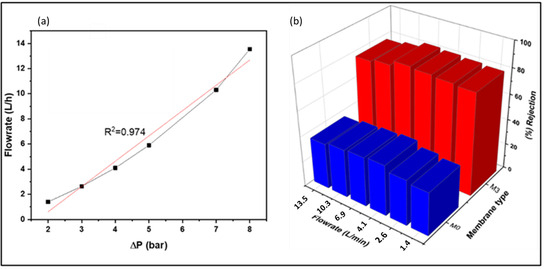 where is the volumetric flow rate, is the cross-sectional area of the membrane, is the permeability coefficient, is the pressure difference across the membrane, and is the length of the membrane. The Darcy model illustrated a relationship with R2 = 0.974 (Figure 14a). Indicating ease of calibration between pressure and flow rate in systems that employ nanocomposite membranes; hence, one property (pressure or flow rate) was investigated instead of both. To understand how flow rate affects the removal performance of naproxen, flow rates in the range of 1.4 to 14 were investigated.