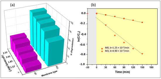 where is the power in watts, is the illuminance in lux, A is the irradiation area, and is the luminous efficacy. Figure 15 depicts the influence of light intensity on the degradation of naproxen. Degradation performance for M3 was observed to improve with light intensity (from 60 to 91%). An increment in light intensity increased the supply of photon energy, which enhanced photoexcitation of the active sites of the membrane, and more reactive radicals were generated. It is reasonable to think that, at higher light intensities, the light irradiates deeper into the membrane, thus activating more CoFe2O4 nanoparticles embedded in the membrane. These results agreed with CFD radiation simulation results (Section 4.5). An increase in light intensity resulted in more photons being absorbed by the membrane’s active sites. Similar trends were observed for M0. The membrane M0 served as the control in our study and was also used to demonstrate the contribution of photosensitization as the light intensity was increased. As the intensity of light increases, the photosensitization of naproxen also increases. However, for membrane M3, despite the contribution from photosensitization, the dominant mechanism for pollutant removal was photocatalytic degradation.