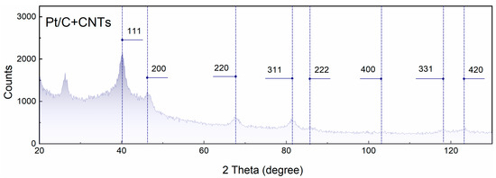 X-ray diffraction pattern of Pt/C+CNTs electrode. Blue lines correspond to the diffraction peaks at about 40°, 46°, 68°, 81°, 86°, 104°, 118°, and 123° due to Pt (111), (200), (220), (311), (222), (400), (331), and (420) reflections.