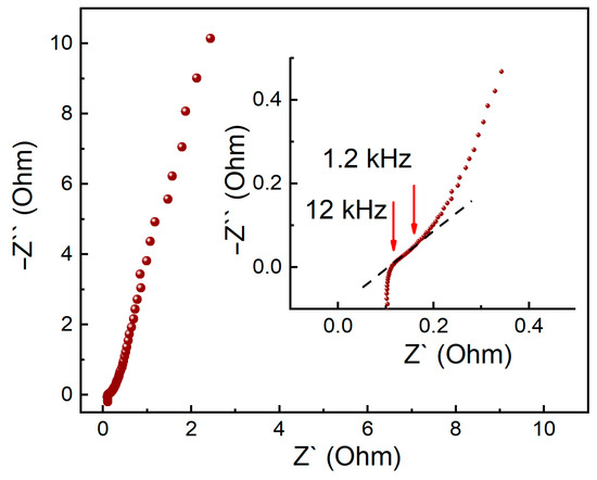 Nyquist plot of the MEA_CNT-34 sample in the humid H2/N2 systems at room temperature and atmospheric pressure; a larger area of high frequencies is shown in the inset. The points correspond to the experimentally obtained data. Red arrows indicate the beginning and end of the straight section of the graph.